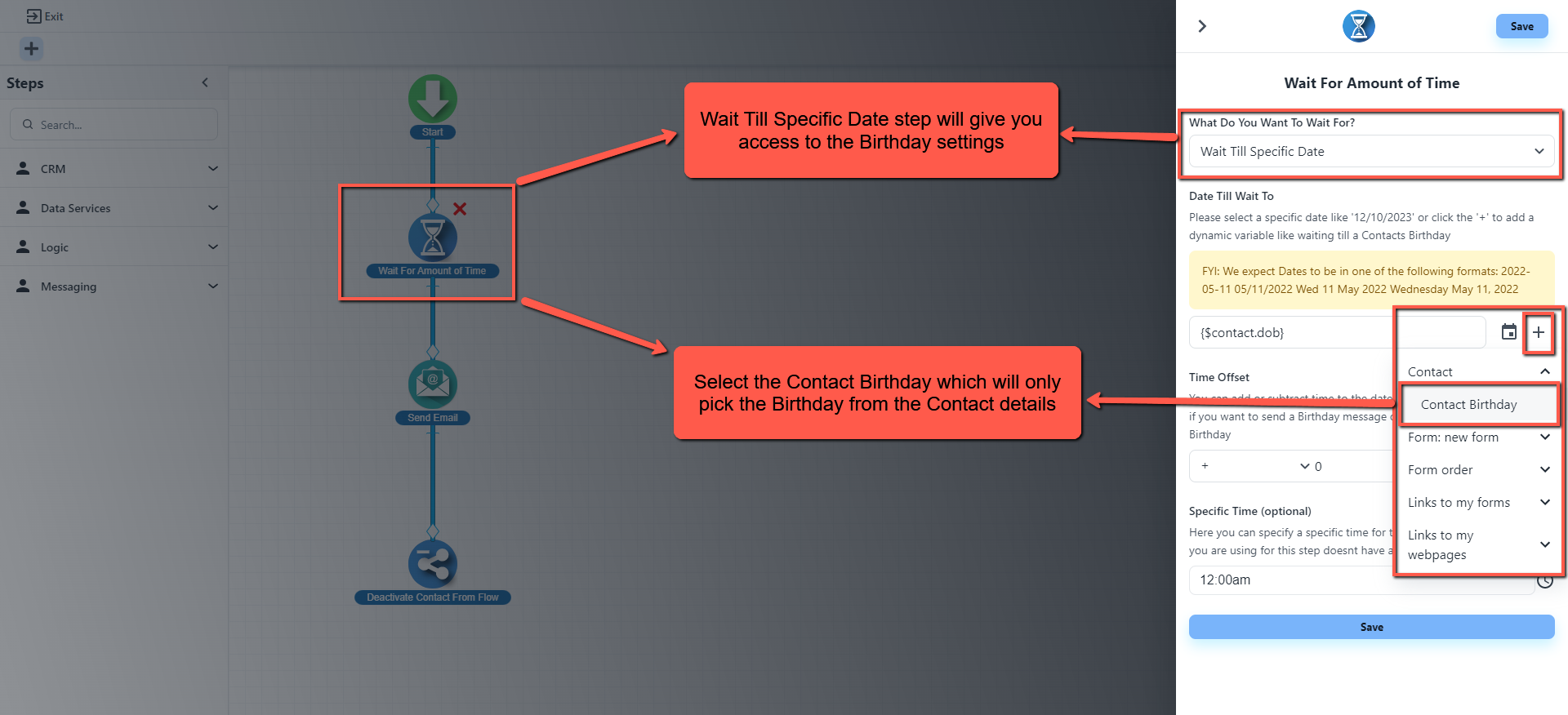 You can find this item in the Logic Section and is basically used for many things such as informing the Customer just before the Scheduled Meeting whether it could be weeks, days or even minutes or sending them Birthday wishes or anything else. It can be used for multiple scenarios but in this case we are using it as a reminder for the Birthday wishes.