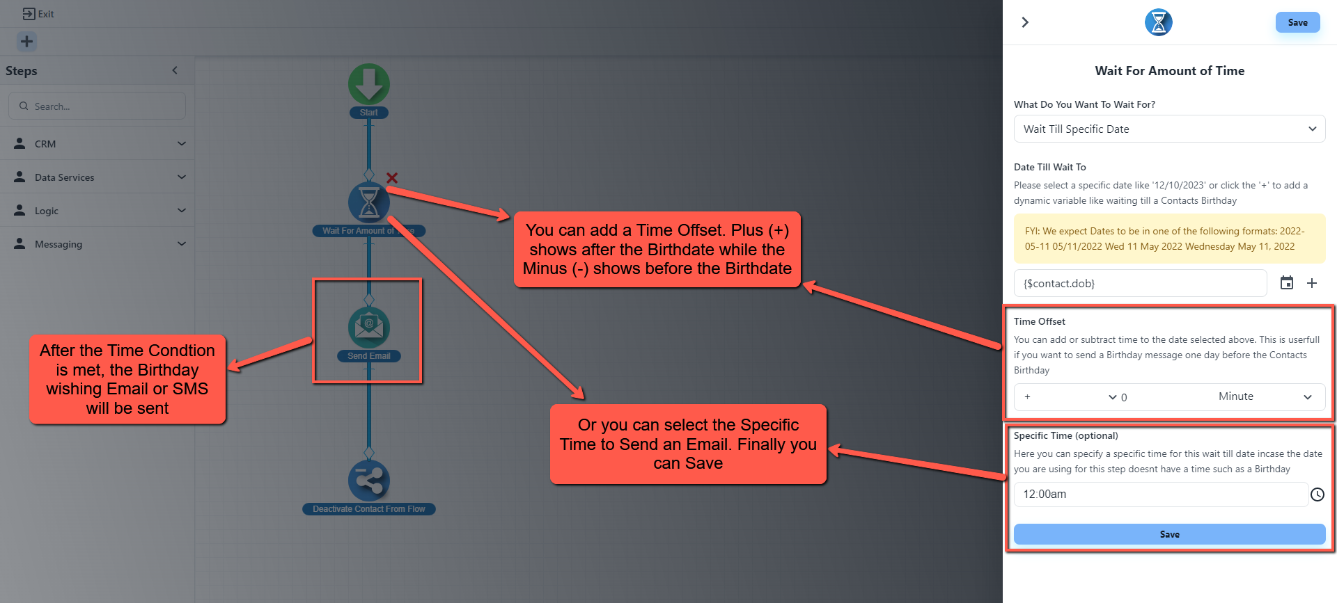When you have completed the Wait for Amount of Time Step you can send the SMS or an Email. This will send the customer a Birthday Wish on the exact date of his Birthday.