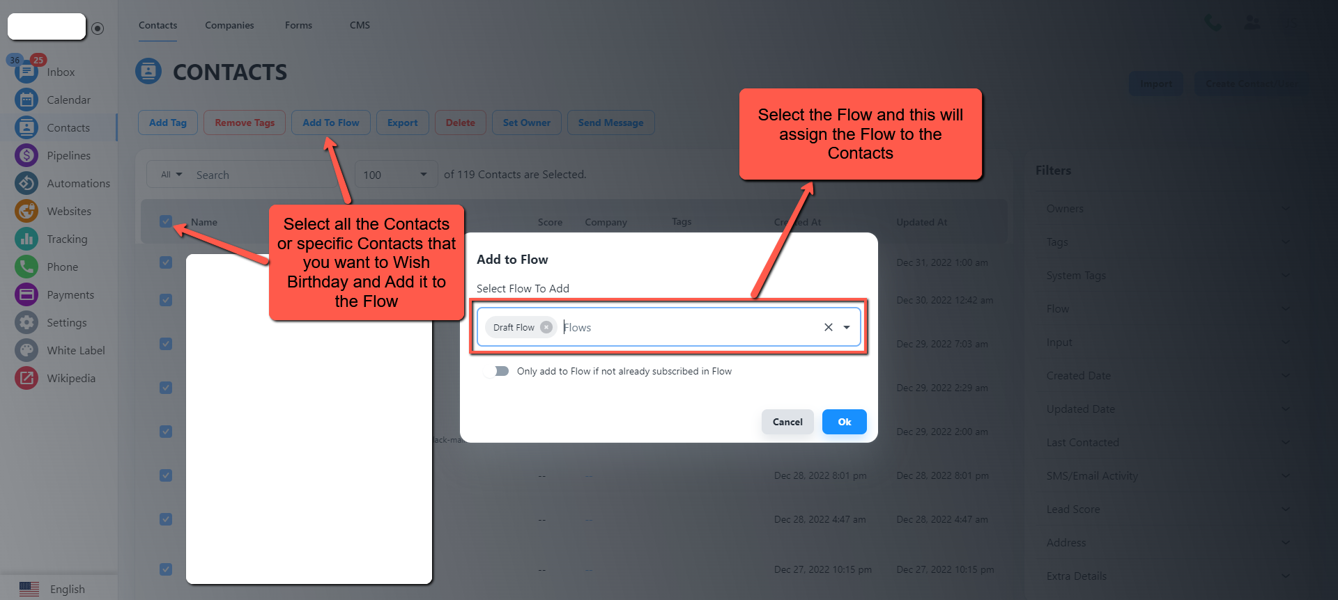 Once the Flow is created you need to assign the Flow to Contacts. At the moment we don’t have a specific Trigger for the Birthday so in this case you need to assign the contacts manually to the Flow.