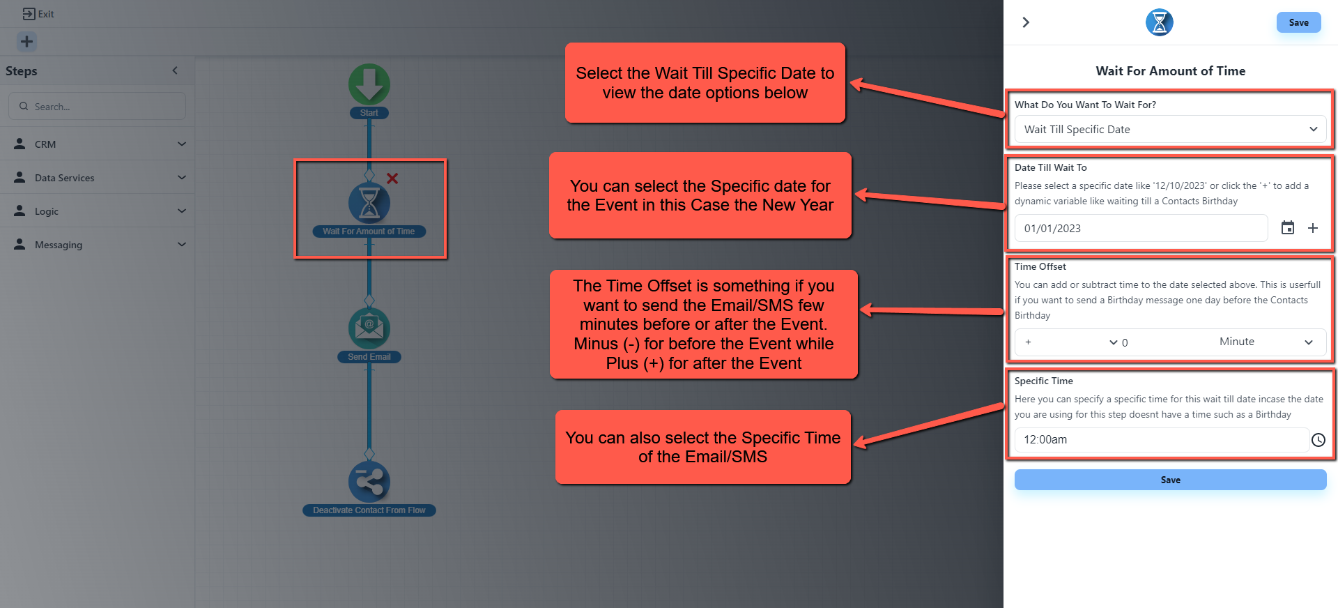 You can find this item in the Logic Section and is basically used for many things such as sending the Customer a New Year Greeting SMS/Email, Scheduled Meeting, Birthday wishes or anything else. It can be used for multiple scenarios but in this case we are using for a greeting message or wishing New Year.