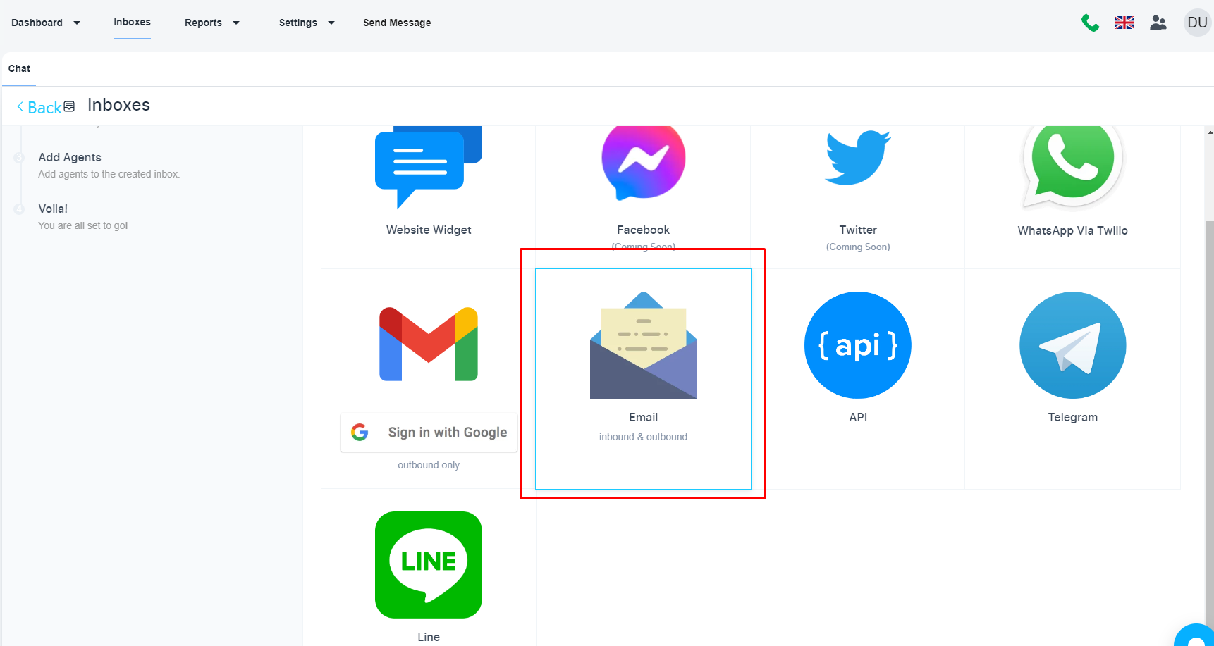 No, click on the ‘Add Inbox’. Choose the ‘Email’ option to add an email associated with your domain.