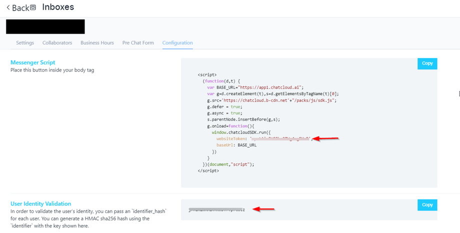 Copy website token and hash value once website widget is created. You can find website token and hash value under configurations as mentioned in below screenshot: