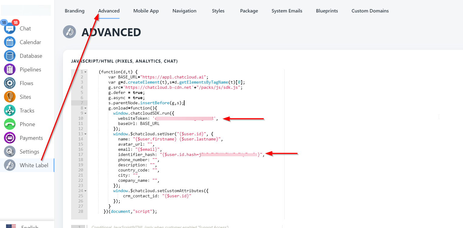 - Paste this websitetoken and hash value in your white-label → Advanced script as mentioned below