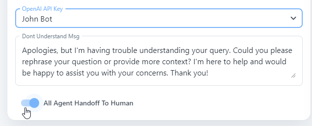 When the "All Agent Handoff To Human" option is enabled, the chatbot will act as a pass-through, routing all user messages to a designated human agent or support team for handling. This can be particularly helpful in cases where you expect complex or sensitive queries that require human expertise or judgment.