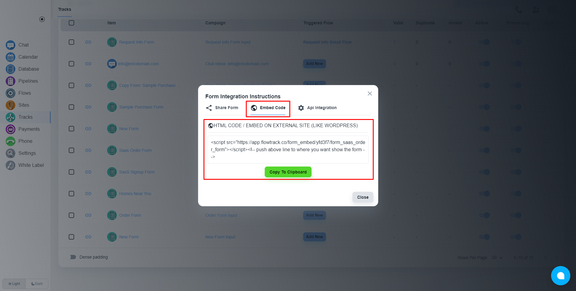 💡 System forms can be embedded into third-party websites using an embed code that is generated in the system. You can also include a link to your form in your emails, SMS, social media posts, and the likes to gain traffic to your forms.